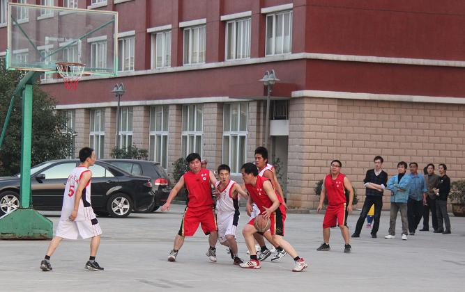 爱好体育的员工晚上没事可到灯光球场比拼一下
